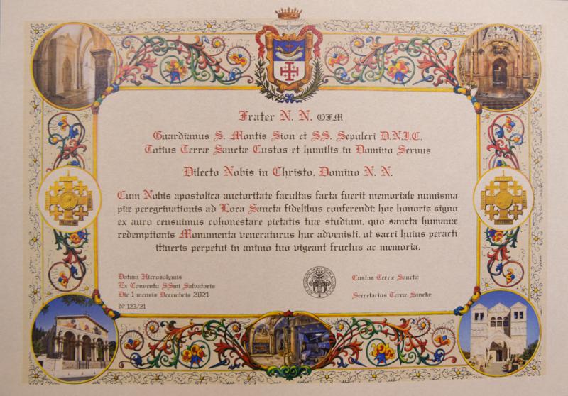 האח הפרנציסקאני [שם] האחראי על הר ציון הקדוש ושל כנסיית הקבר של ישוע המשיח האדון, הקוסטוד של כל ארץ הקודש ומשרת ענו של האל, אל [ אדון / גברת] (שמות), הנאהבים על יד המשיח. תחת סמכות האפיפיור, אנו רשאים להעניק את האישור על וידוי של האמונה את המדליה של עולי הרגל למקומות הקדושים, באמצעות הכרת הכבוד (ברונזה, כסף או זהב) והחלטנו לכבד את הדבקות שלך, תודות לכך שבאת לכאן על מנת לתת כבוד למונומנטים הקדושים של הישועה האנושית, כך שפירות הזיכרון של דרך קדושה זו ושלמו על ידך ומי ייתן ויחיו בליבך לעד.
