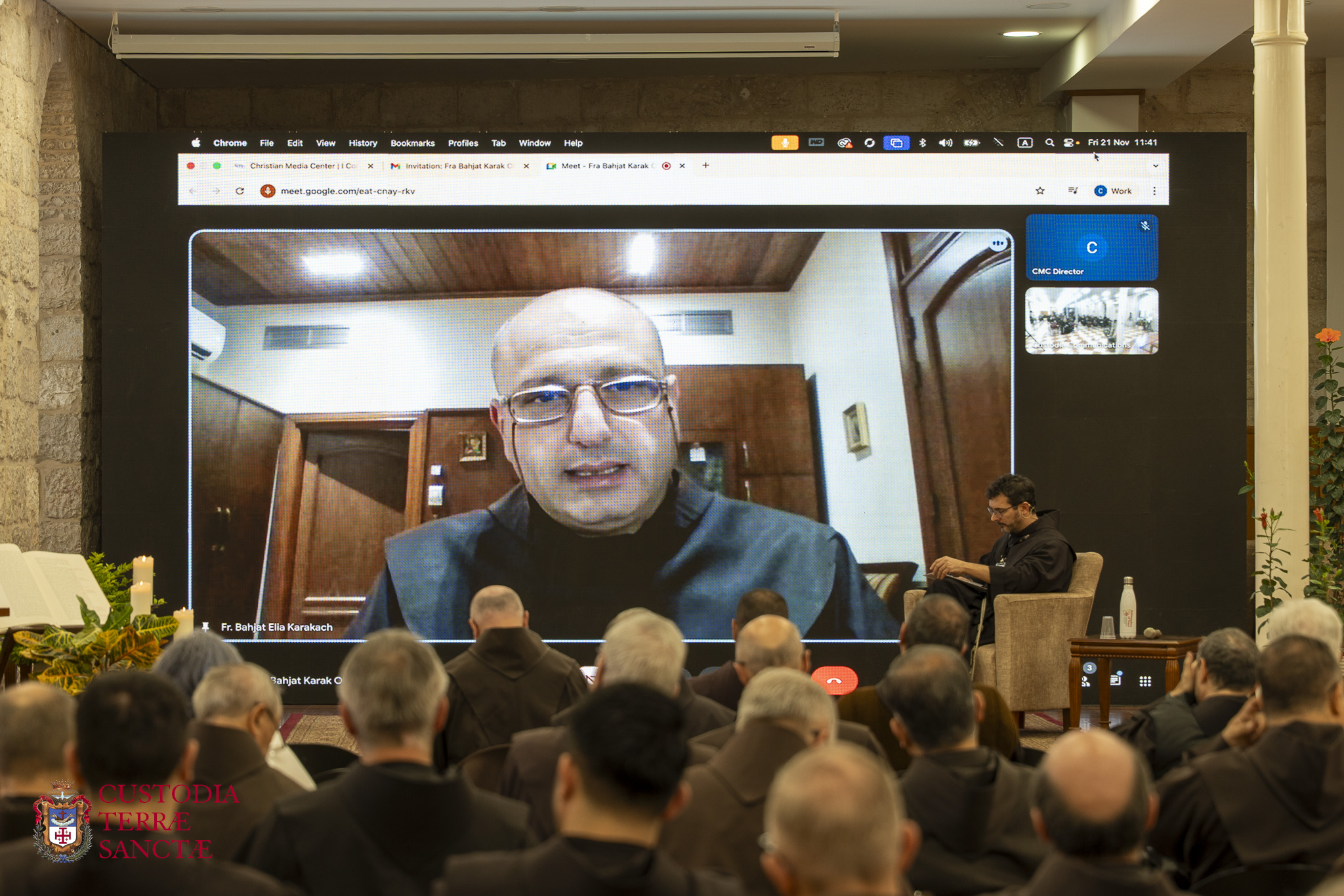 In the second part of the morning, the assembly experienced a highly anticipated moment: the live connection with Syria to listen to the intervention of Fr. Bahjat Karak OFM. The program indeed included a session dedicated to "The action of the Franciscans in Syria", a contribution designed to offer the Commissaries a direct look at one of the most afflicted realities in the Middle East. The connection was introduced by Fr. Brena, recalling the importance of opening one's gaze beyond the boundaries of the Holy Land, to understand how the Franciscan mission accompanies peoples and communities marked by years of conflict, instability and poverty.