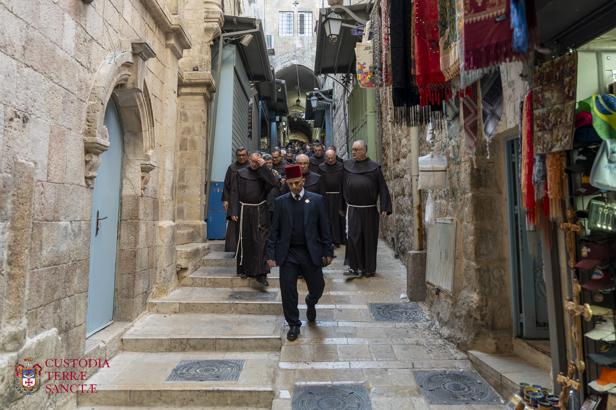 In the early afternoon, after the community lunch, the Commissaries gathered together with the custos to celebrate the Way of the Cross through the streets of Jerusalem. They walked on those same stones, in the same alleys that saw Jesus pass on the day of his Passion. Every step, every stop along the Via Dolorosa was a return to that ancient path, an immersion in the living memory of the city.