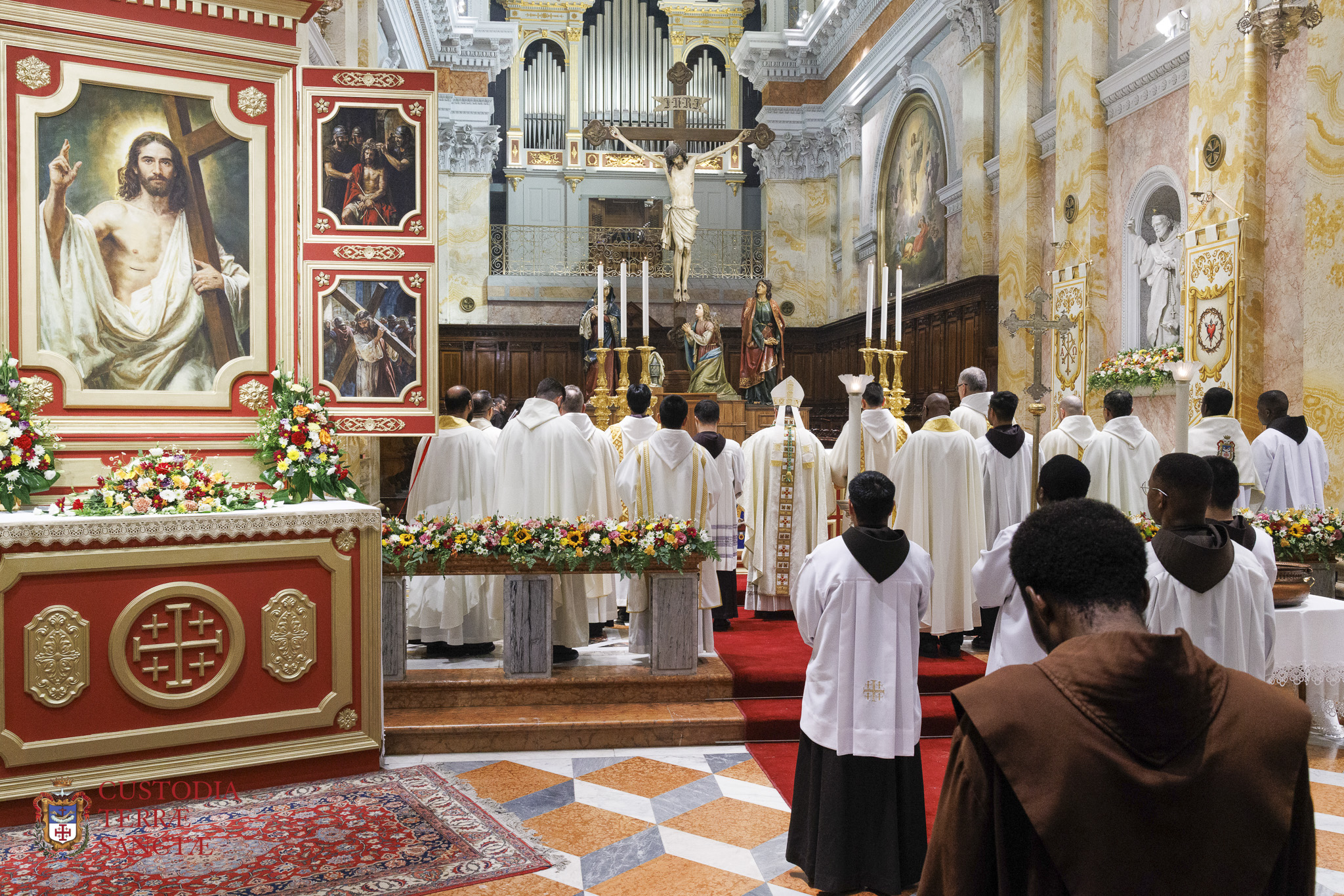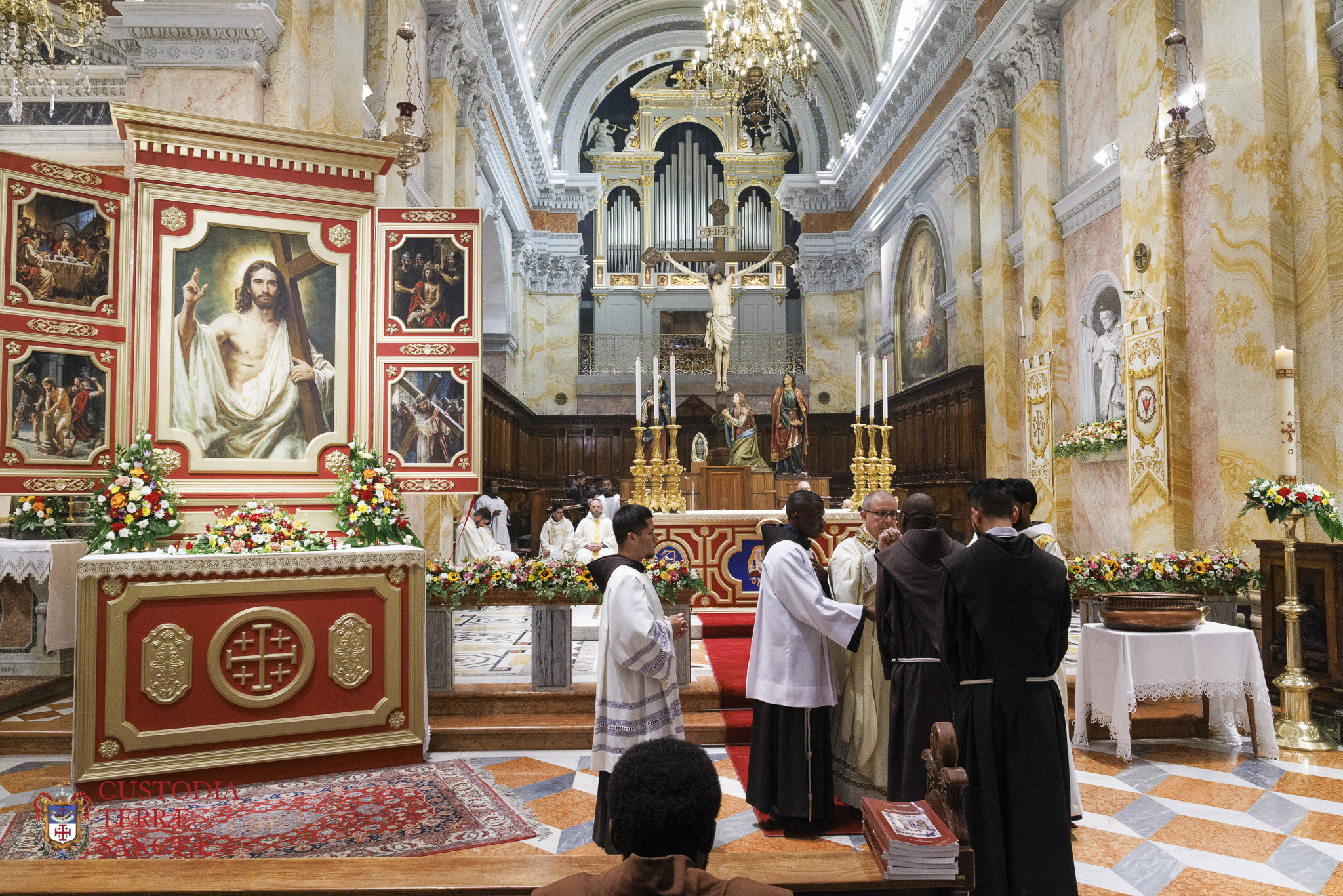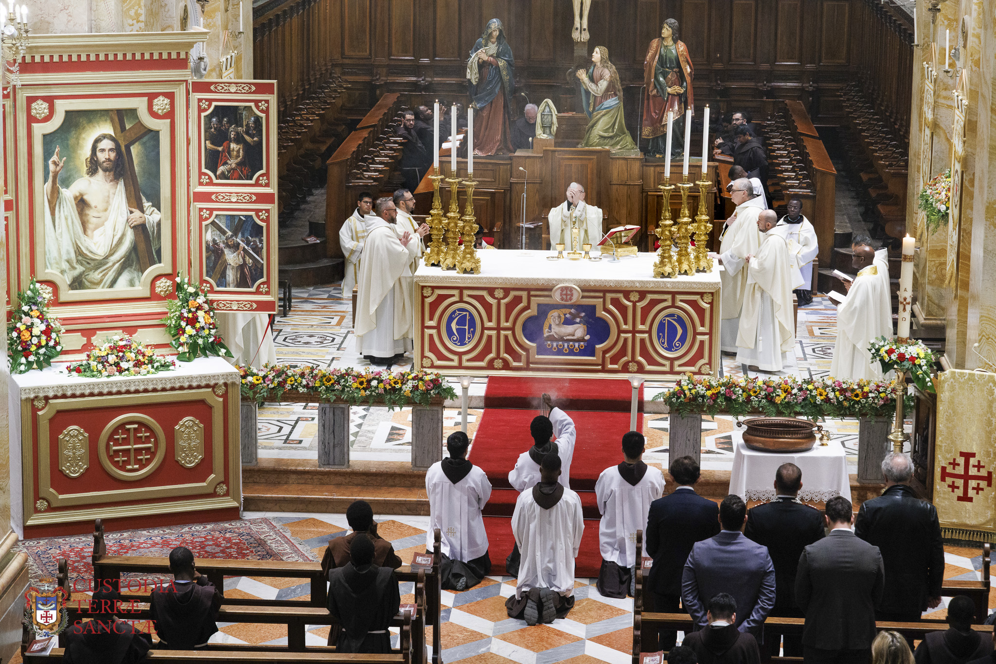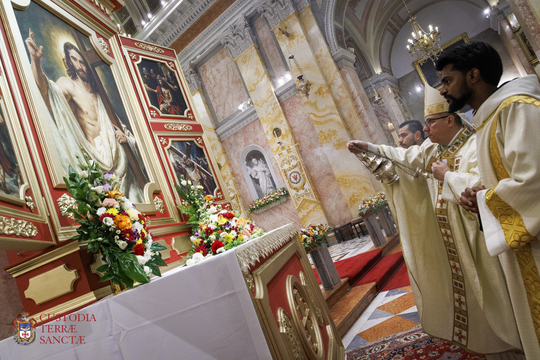 At the beginning of the Eucharistic celebration, the Custos paused before the artistic decoration prepared next to the presbytery and, with a symbolic gesture full of emotion, the two deacons simulated the opening of the tomb, opening the panels of the triptych and revealing the image of the risen and victorious Christ.