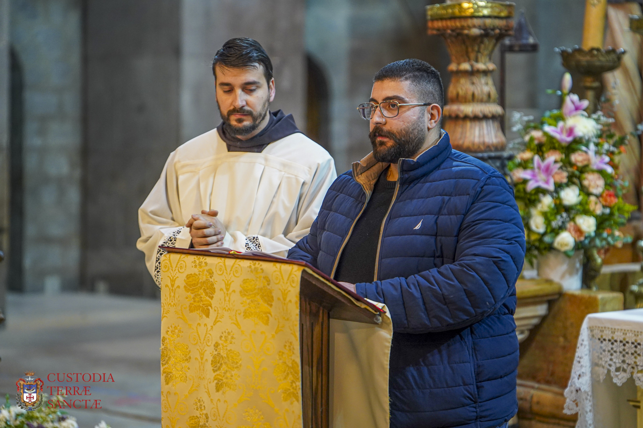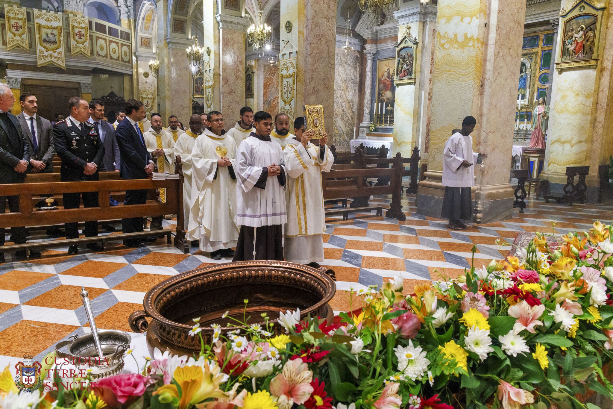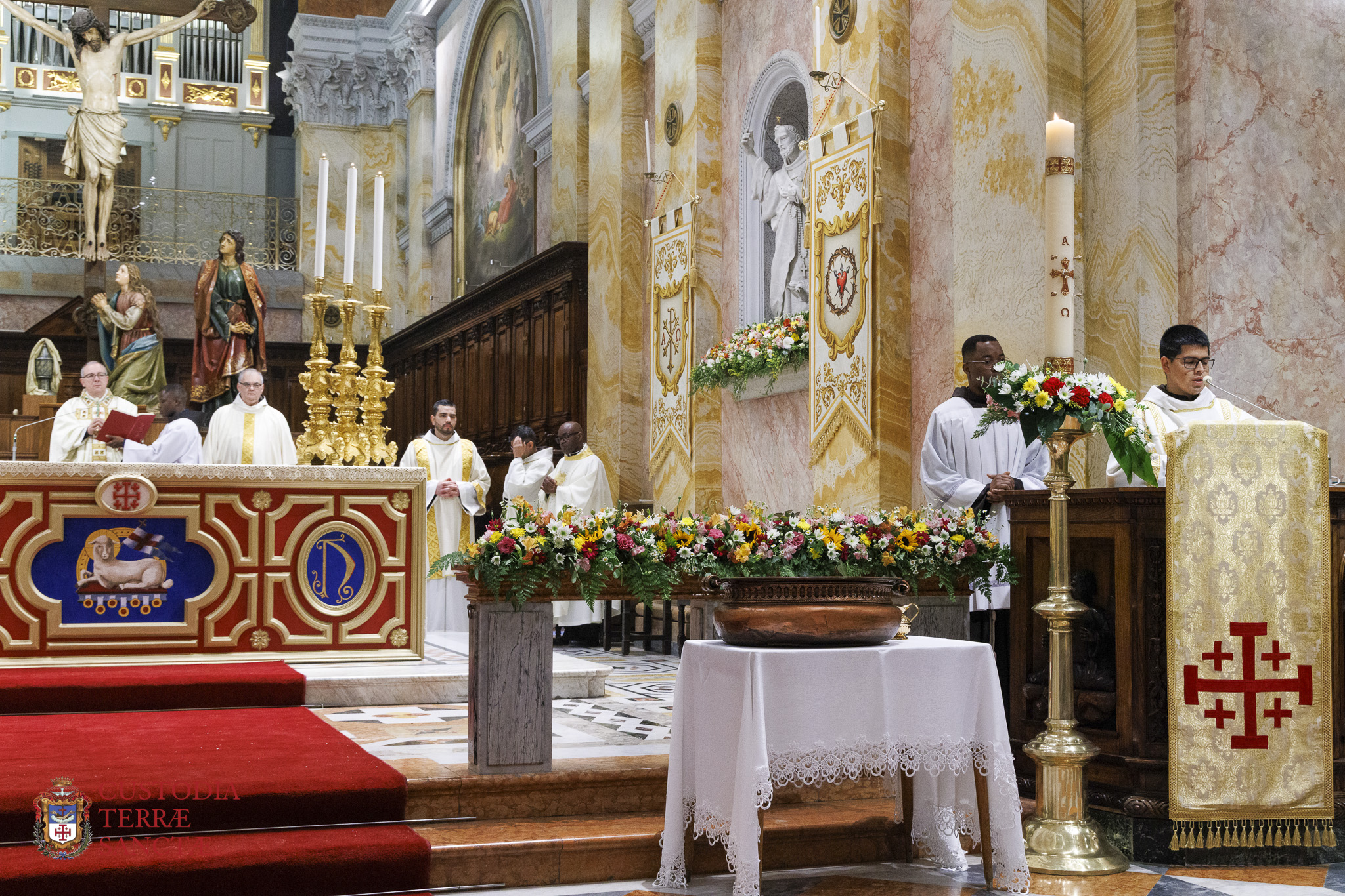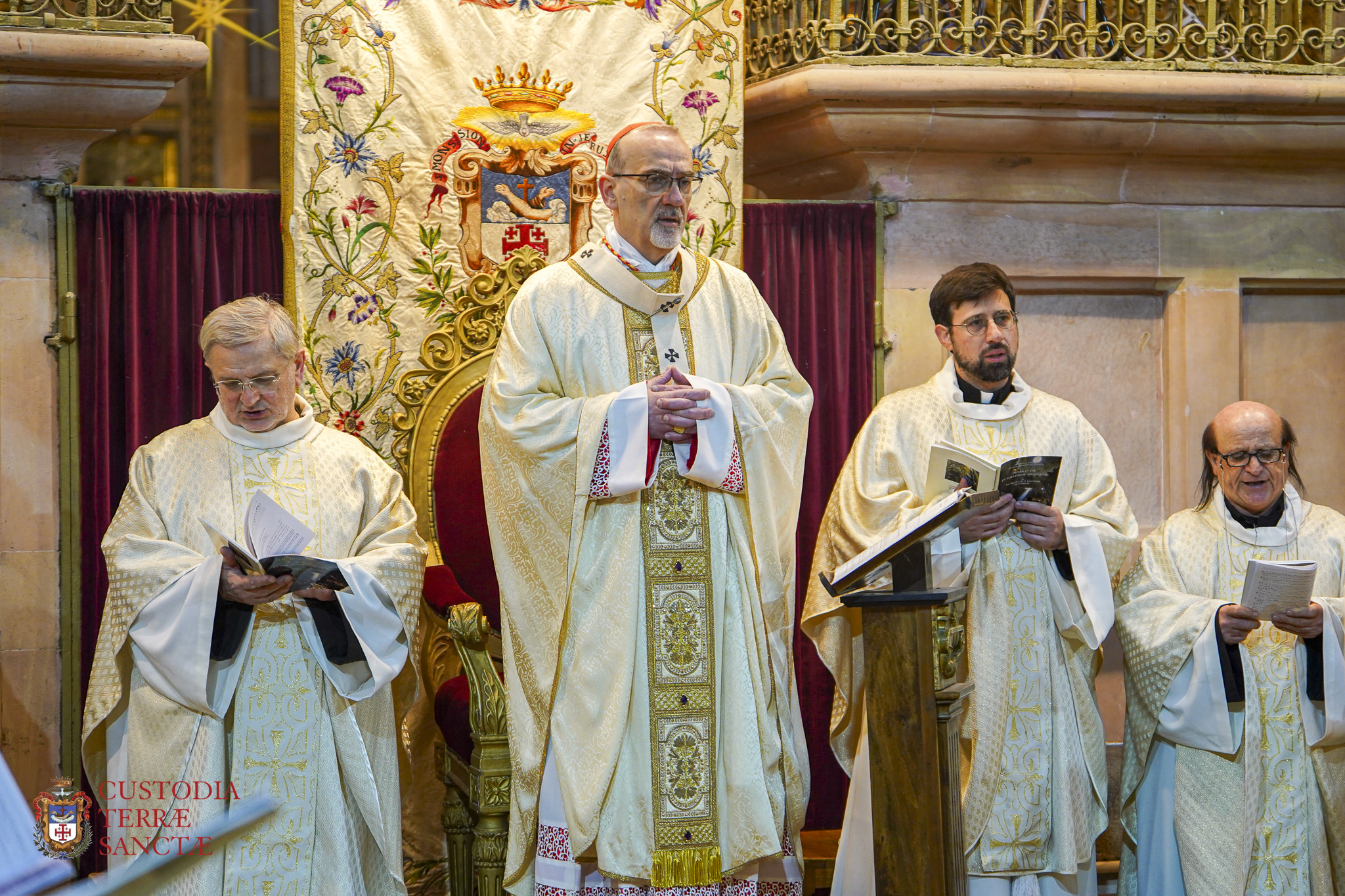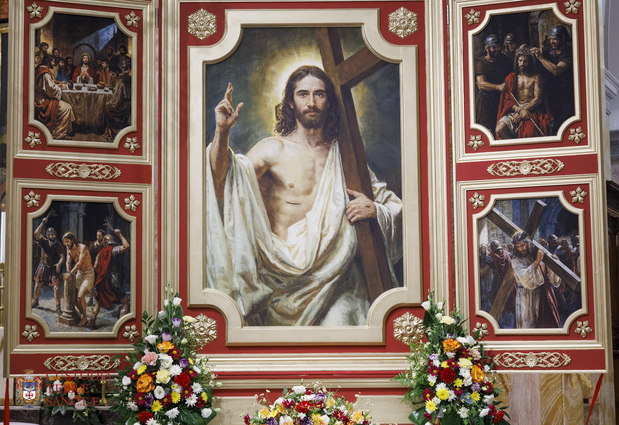 At the beginning of the Eucharistic celebration, the Custos paused before the artistic decoration prepared next to the presbytery and, with a symbolic gesture full of emotion, the two deacons simulated the opening of the tomb, opening the panels of the triptych and revealing the image of the risen and victorious Christ.