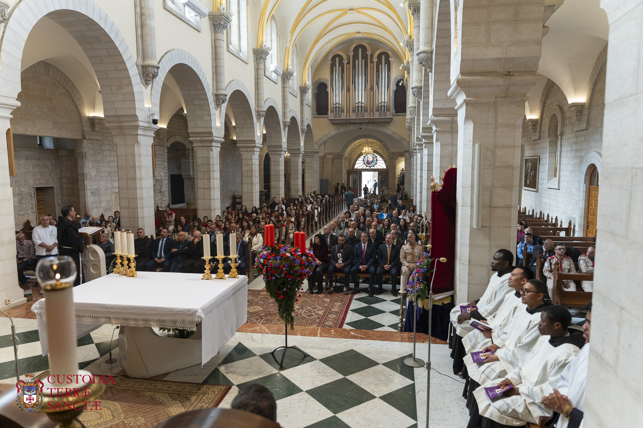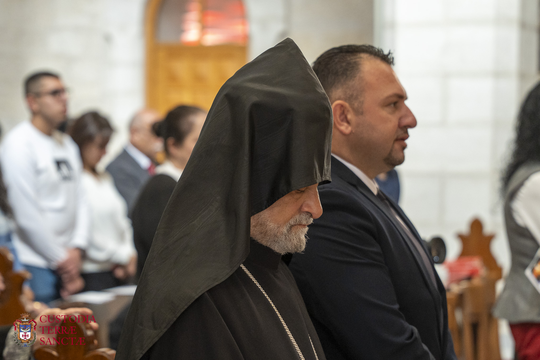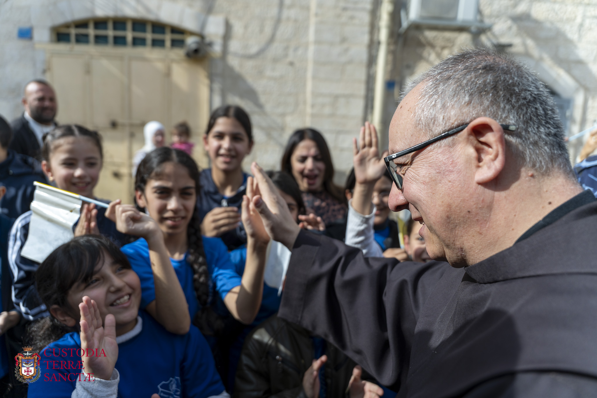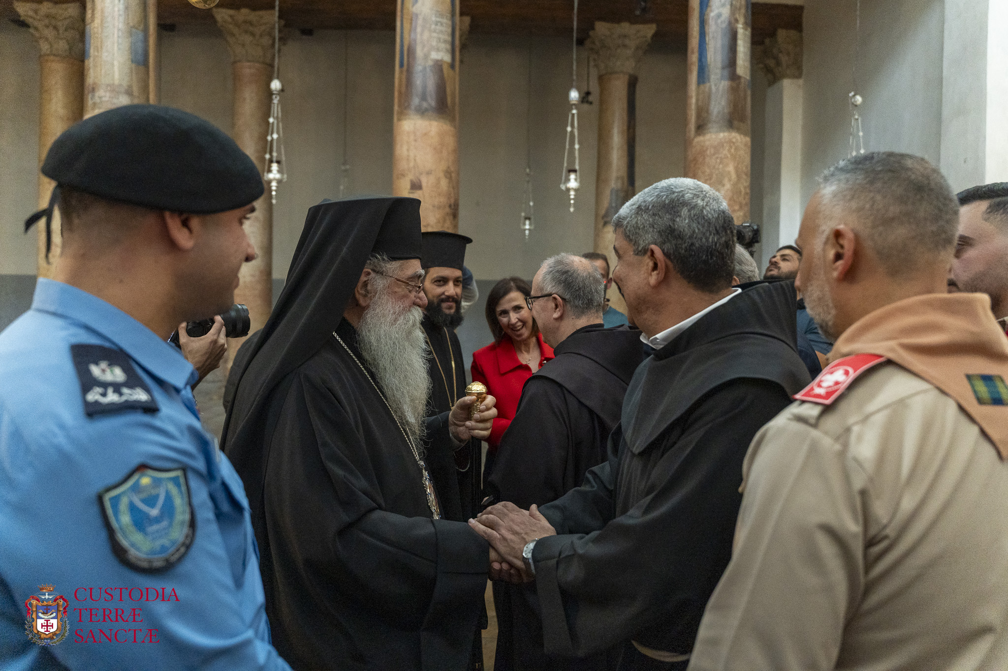 Arrivé sur la Place de la Nativité, accueilli par les étudiants du Terra Santa College de Bethléem ainsi que par d’autres autorités civiles, citoyens et fidèles locaux, le Custode a ensuite fait son entrée dans la Basilique de la Nativité par la porte qui mène à la Basilique Orthodoxe, où il a été reçu par les autorités des Églises Orthodoxes Locales.