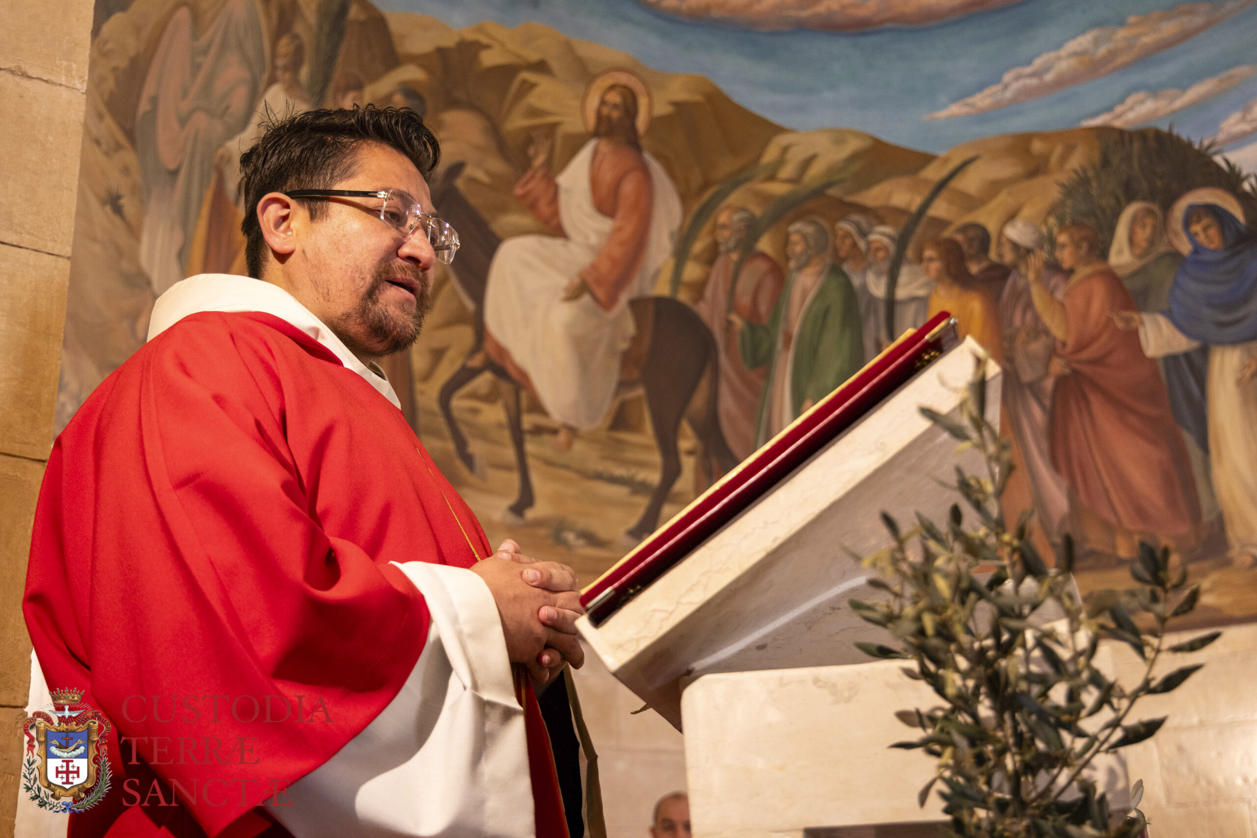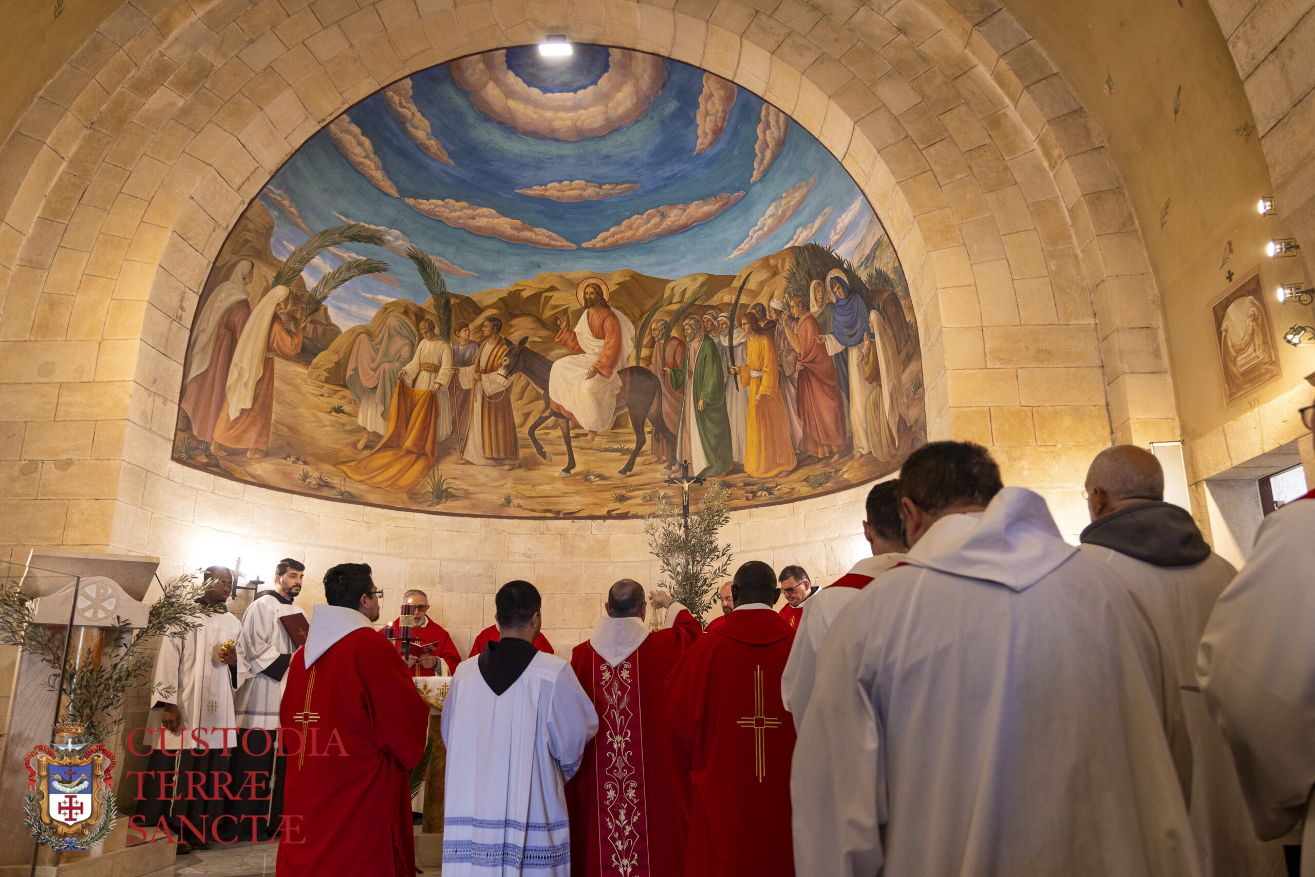 כאן הליטורגיה נערכה על ידי המזכיר של ארץ הקודש, האח הפרנציסקאני אלברטו חואן פרי, בנוכחות של מען כהני דת מסייעים, מזמין את ההרהור של המשיח שהוכרז של ידי הנביא זכריה, מלך "צודק ועניו", שיכנס לעיר הקדושה לא בכוח צבאי אלא עם צניעות של אדם שממלא את רצון האב. צדק מקראי כפי שהזכיר המטיף האח פיירמרקו לוציאנו, אינו מאופיין כעליונות מוסרית, אלא חיפוש וקבלה של רצון האל. ישוע המשיח הינו הצודק משום שהוא יכול לומר "הגעתי מן השמיים לא לעשות את רצוני שלי , אלא את הרצון של מי ששלח אותי".