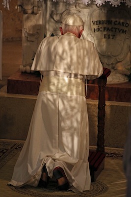 «In quell’ora, Gesù ha sentito la necessità di pregare e di avere accanto a sé i suoi discepoli, i suoi amici, che lo avevano seguito e avevano condiviso più da vicino la sua missione. Ma qui, al Getsemani, la sequela si fa difficile e incerta; c’è il sopravvento del dubbio, della stanchezza e del terrore. Nel succedersi incalzante della passione di Gesù, i discepoli assumeranno diversi atteggiamenti nei confronti del Maestro: atteggiamenti di vicinanza, di allontanamento, di incertezza. Farà bene a tutti noi, vescovi, sacerdoti, persone consacrate, seminaristi, in questo luogo, domandarci: chi sono io davanti al mio Signore che soffre? Sono di quelli che, invitati da Gesù a vegliare con Lui, si addormentano, e invece di pregare cercano di evadere chiudendo gli occhi di fronte alla realtà? O mi riconosco in quelli che sono fuggiti per paura, abbandonando il Maestro nell’ora più tragica della sua vita terrena? C’è forse in me la doppiezza, la falsità di colui che lo ha venduto per trenta monete, che era stato chiamato amico, eppure ha tradito Gesù? Mi riconosco in quelli che sono stati deboli e lo hanno rinnegato, come Pietro?».