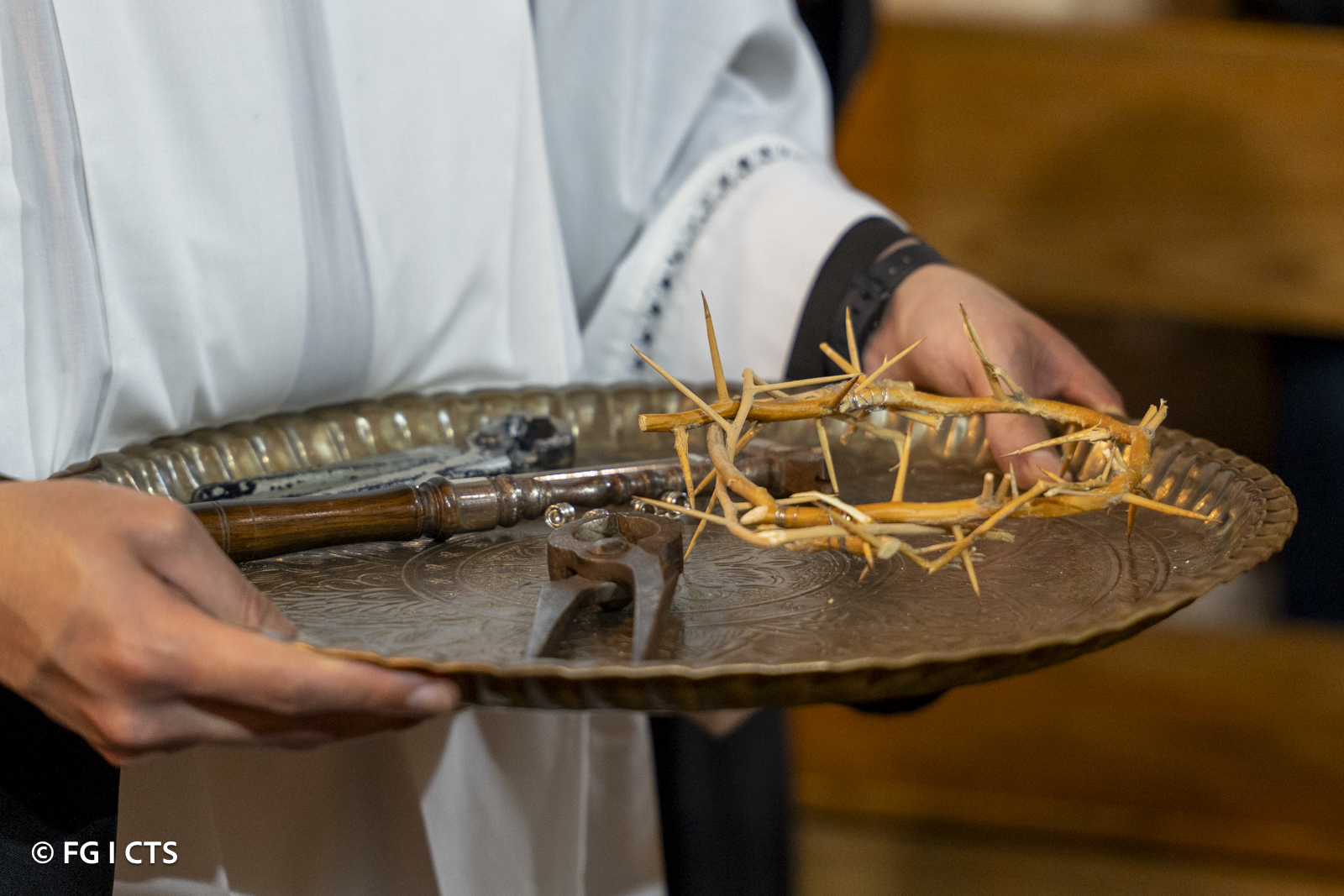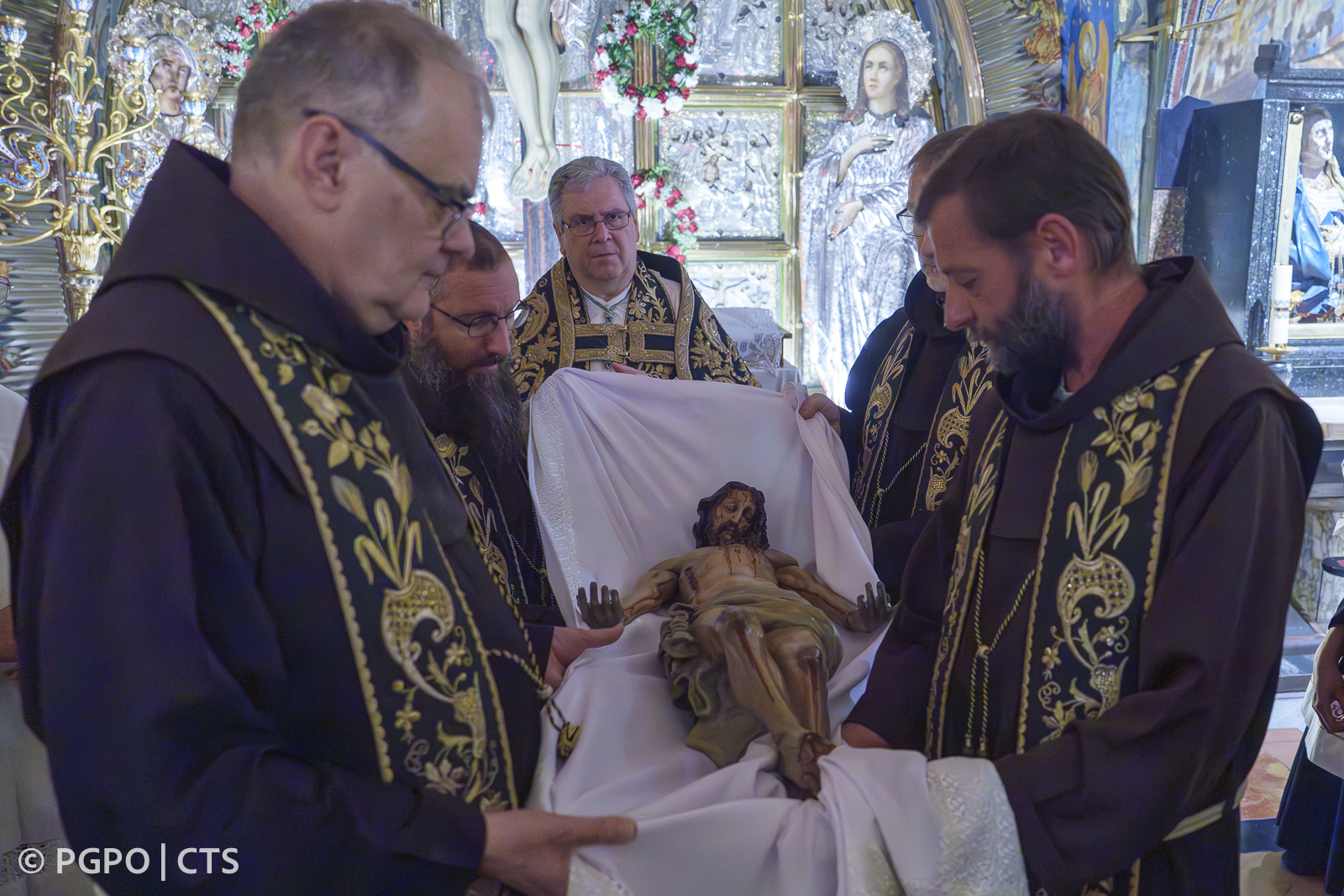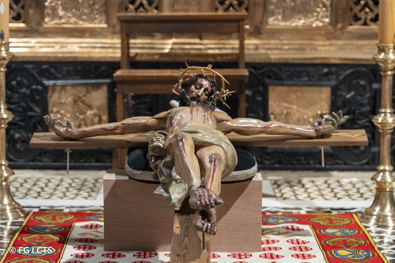 La cerimonia inizia nella Cappella dell'Apparizione, dove i frati francescani della Custodia di Terra Santa, vestiti con paramenti neri ricamati in oro e argento, intonano il Salmo 51 "Miserere mei, Deus", creando un'atmosfera di profonda contemplazione. Il Crocifisso, con una statua di Cristo inchiodata, viene portato in processione verso il Calvario, accompagnato dal silenzio e dalla preghiera dei fedeli.