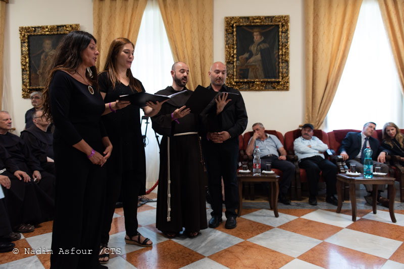 A acolher o Presidente Rivlin foi o canto do Quarteto do Magnificat, formado pelo Diretor Fr. Alberto Pari, a Vice-Diretora Giuliana Mettini e as estudantes Eleonora Lué e Tareq Wahba acompangnados no piano por Maria Spitkovski. Em seguida, Fr. David Grenier, Secretário da Custódia, fez a introdução, acolhendo os presentes e recordando o fato dos 800 anos da presença franciscana na Terra Santa.